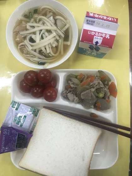 豚肉とごぼうの煮物、なにわうどん、プチトマト、食パン、牛乳、ブルーベリージャム、ととろ昆布