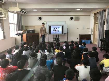 ロボットは何なのかということや、これからのロボットのことなどを教えていただきました。また、「"しなやかな"ロボットを作る」ということで、仲田先生が研究されているロボットについても紹介していただきました。新聞やニュースで紹介された「ibuki」というロボットを研究されていると聞き、子どもたちは驚きの様子でした。