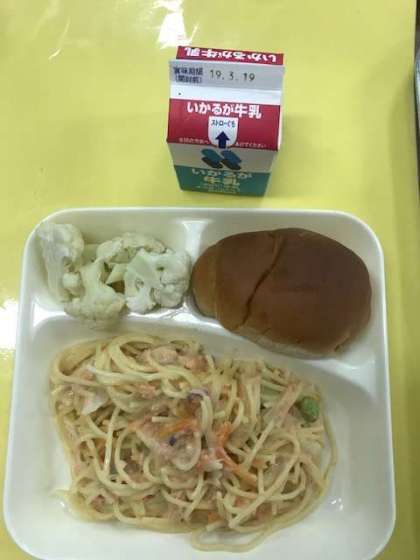 さけのクリームスパゲティ、カリフラワーのサラダ、パン、牛乳