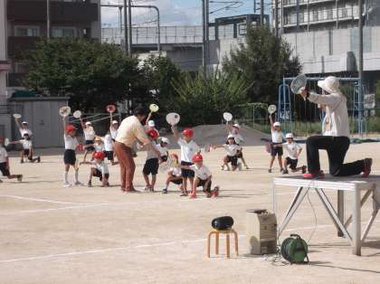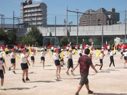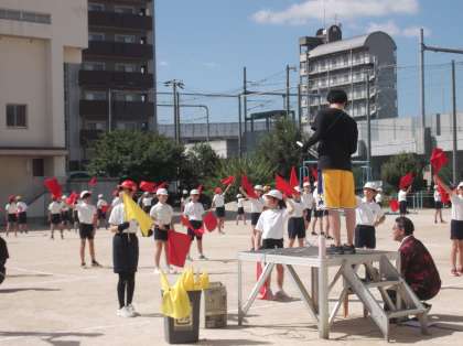 2年生はうちわを、5・6年生は旗を持って練習をしていました。