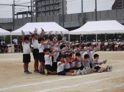 4年「十人十色 いちゃりばちょ〜で〜」は、ムラサキの布を頭に巻き、パーランクの音が響き渡りました。掛け声もそろった迫力ある演技でした。