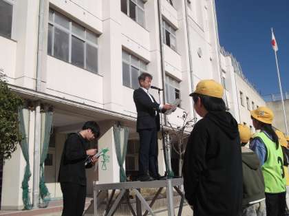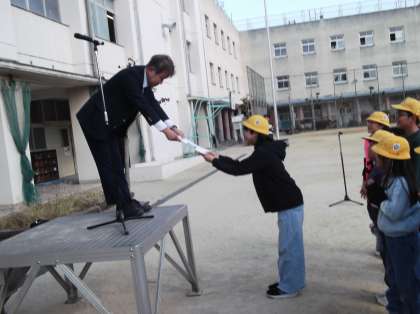 校長先生から、5年生のリーダーに表彰状が手渡されました。