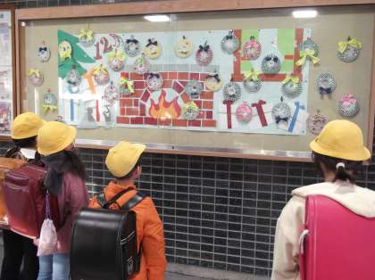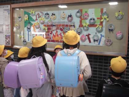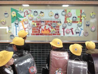 玄関掲示が変わりました。炎がともる暖炉の周りには、たくさんのリースが飾られていました。