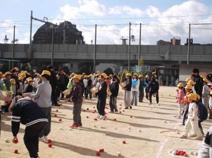 ふれあい班に分かれて、紅白玉を一人2個ずつバケツめがけて投げます。
