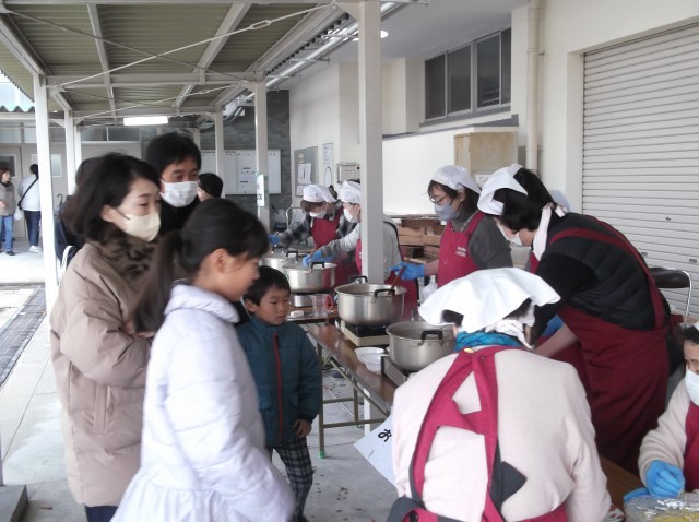 給食室前ではお雑煮ときな粉餅が振る舞われ、長い列ができました。