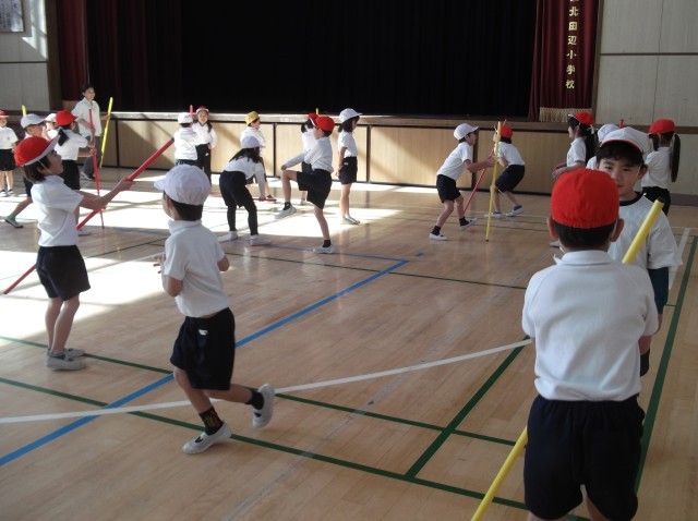 棒が倒れない間に拍手をしたり、棒のまわりを一周したりします。