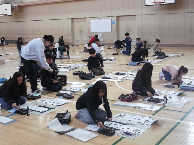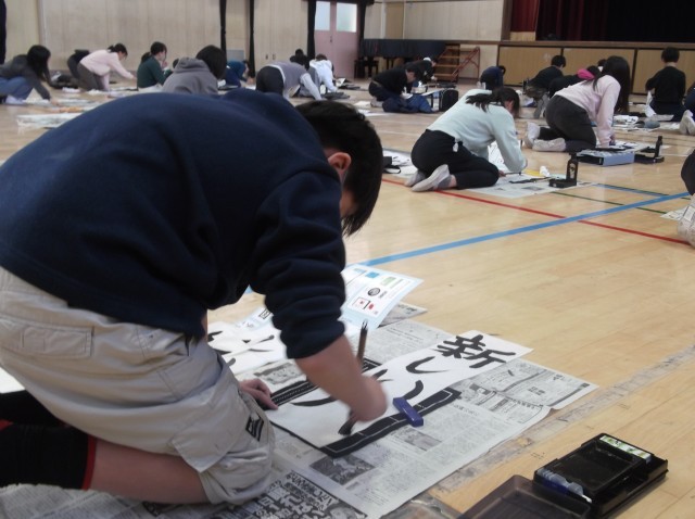 5年生が講堂で書き初め大会を行いました。