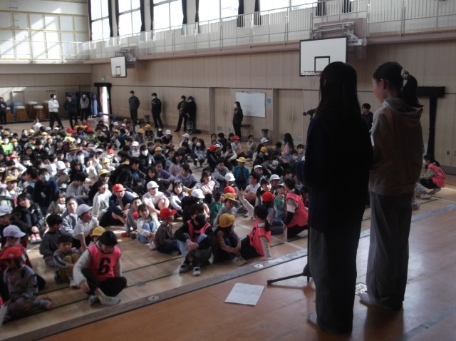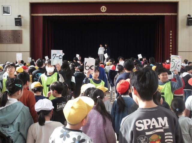講堂で今年最初の児童集会が開かれました。                                                          「去年をふり返ろう2025年クイズ」です。                                                         クイズは3択です。                                             答えが1番なら1列に、2番なら2列に、3番なら円に、時間内に班の並び替えを行います。                                          まず、大阪万博に関するクイズがありました。                                                     開催日や来場者数などが出題されました。                                       去年を表す漢字、新総理大臣の名前、値上がりした食材、映画の上映日など、全6問で昨年をふり返りました。                            全問正解できたでしょうか。