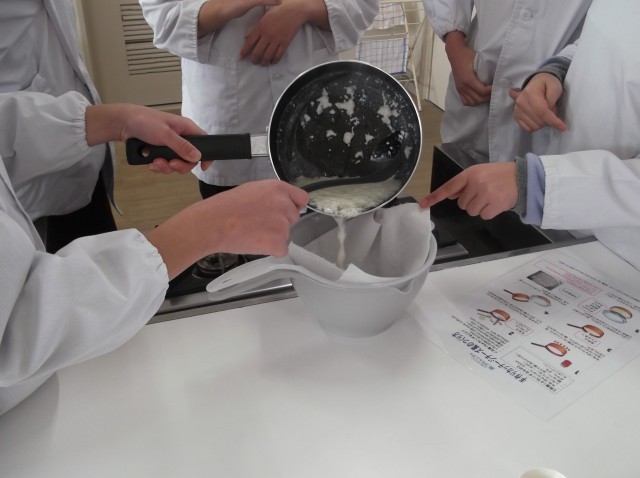 雪印メグミルクよりゲストティーチャーをお招きして、6年生が出前授業を受けました。 まず集会室で「骨とカルシウム」、「カルシウムの役割」、「1日に摂りたいカルシウム推奨量」をプレゼンしてもらいました。また、大きなホルスタイン乳牛が1頭登場して、びっくりさせられました。 12~14歳の男性は1日に1000mg、女性は1日に800mgカルシウムを摂取するといいそうです。 次に家庭科室に移動し、「カッテージチーズ風」のチーズを作りました。 牛乳を鍋で温めた後、レモン汁を入れました。 白い固まりと液体(ホエイ)に分けるため、キッチンペーパーでこしました。 できたチーズとホエイは、まずそのままで食べた後、ハチミツ味、醤油味にして試食しました。