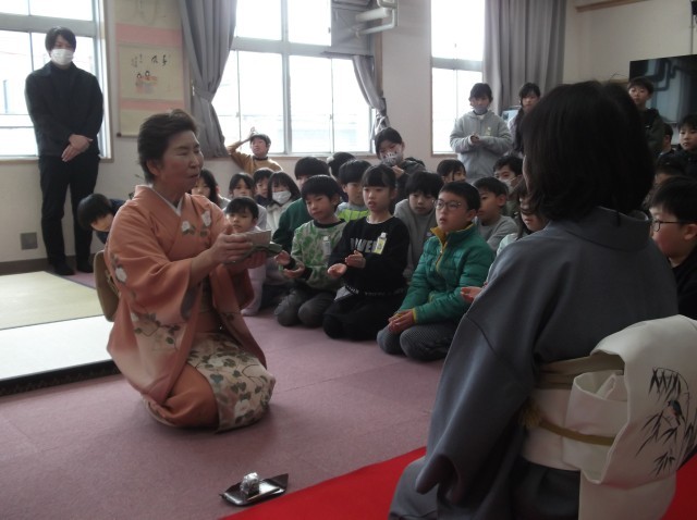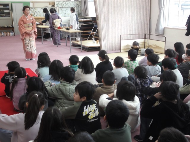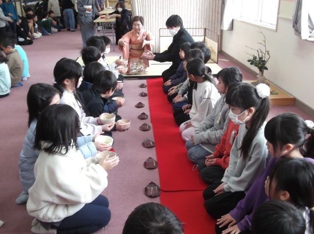 集会室の廊下に、日よけ傘が設置され、『桃花笑春風』、桃の花と菜の花が飾られました。お床には「桃の節句」のお軸が掛けられ、ツバキやハラミ(マユミ)の生け花が飾られました。ひな人形の横にはお香も焚かれ、厳かな雰囲気でした。3年生が今年も茶道体験にチャレンジしました。日本の伝統文化である、お茶のお点前を3つの約束のもと学びました。3つの約束とは、不潔にしない、私語をつつしむ、お道具を大切にする、でした。一人一人、お菓子とお抹茶をいただき、お客様をおもてなしする心、お互いが感謝し合う心を学びました。