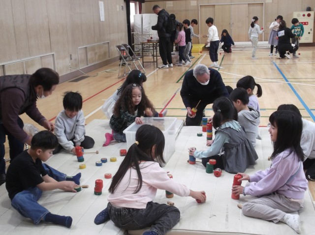 講堂で、1年生が昔遊びを教えていただきました。 教えていただく先生は16人の地域の方です。 8つの班に分かれて、折り紙、こま回し、紙てっぽう、けん玉、だるま落とし、お手玉、おはじき、あやとりの8つのコーナーを巡りました。 各7分間の遊びタイムでした。 各コーナーには地域の先生である昔遊び名人がいて、遊び方や上手く遊ぶコツを教えていただきました。 ふれあい活動を通して、1年生と地域の方とが仲良しになりました。