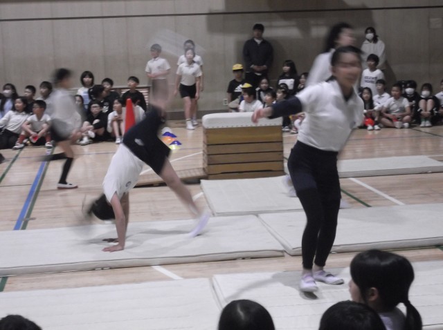体育館で、器械体操クラブによるクラブ発表会がありました。                                                                                          体育館に設置された跳び箱やマットを見て、どんな演技があるのかわくわくさせられました。                                                     照明が落とされ、BGMが流れ、いよいよ本番です。                                                                                  次から次へと繰り広げられる技に、全校児童の目はくぎ付けとなりました。会場が大きな拍手に包まれました。                                                  少ない練習の中、しっかりと技を磨きました。