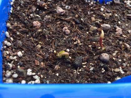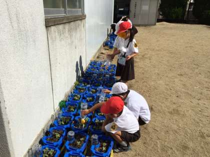 生活科で先週に蒔いたあさがおの種が、もう発芽しました!子どもたちは、「3個芽が出た??」「もうすぐ出てきそう。」など、観察しながら、毎朝嬉しそうに水やりをしています!