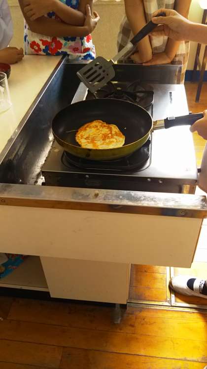 今日は、調理実習でした。4年生は、初めての実習でしたが、5、6年生に優しく教えてもらいました。1人1枚ずつクレープを焼き、トッピングをして完成しました。おいしいと笑顔で食べていました。