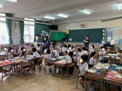 今日の給食の様子です。最後の給食なので、給食室にきて「1学期ありがとうございました!」と調理員さんに伝えているクラスもありました。どのクラスも、楽しそうにみんなで食べていましたね。