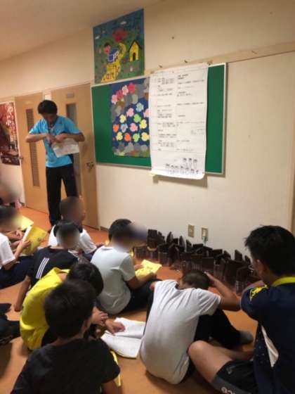 肝試しを終えて、班長会議をしています。今日の反省と明日の予定について話し合っています。林間学習もあと一日です。充実した活動になるよう取り組んでいきます。