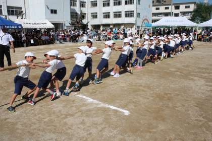 2枚目:団体競技「引っぱらなきゃ だめよ!だめ!だめ!」みんなで力を合わせ、つなを引きました。