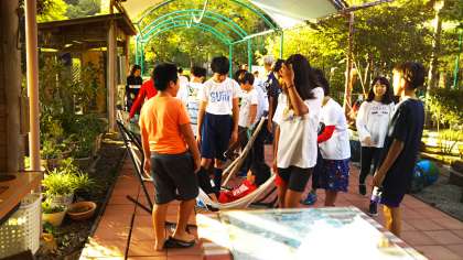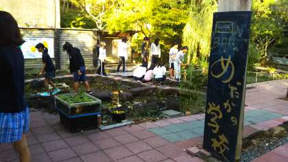 めだかの学校には、池やたくさんの植物があります。めだかの学校の校長先生が大切に育てておられます。足湯やハンモック、オルゴール館など子どもたちが体験できるところがたくさんあって、とても楽しそうです。