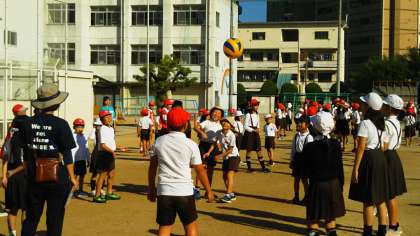 今日は、みんなでソフトバレーラリー大会です。運動委員会の企画で、運動場と講堂に分かれて、たてわり班で行いました。