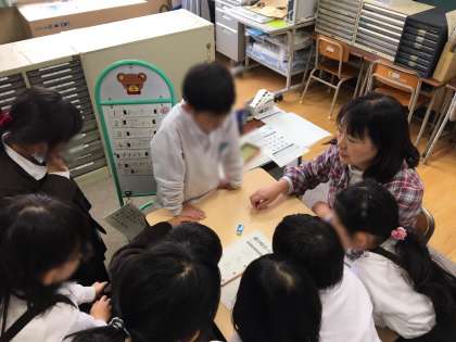 1年生は、ことばの教室に行き、ことばの教室では、どんなことを勉強しているのかを担当の先生に教えていただいています。
