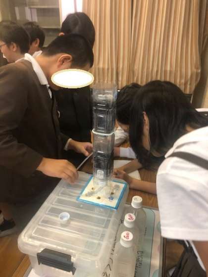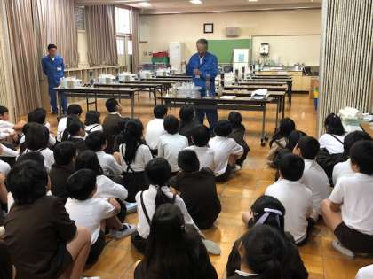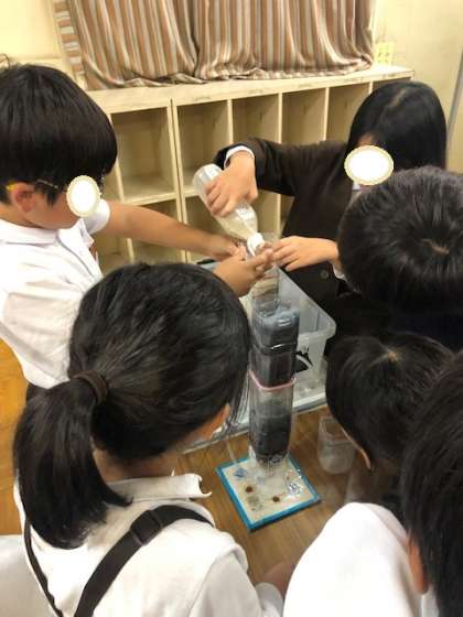 まず、DVD教材で水道水がみんなのもとに届くまでどのような処理が行われているのかを学習し、川の水が水道水になるまでの浄水処理の実験をしました。泥水が砂ろ過と粒状活性炭を通すことで、濁りもなく臭いも気にならない水になりました。