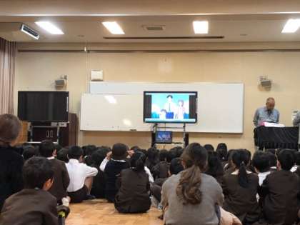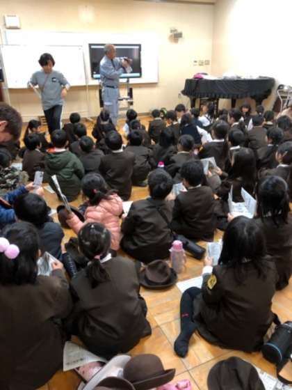 1、2年生は、防災に関するDVDを見たり、新聞紙スリッパ作りを行いました。