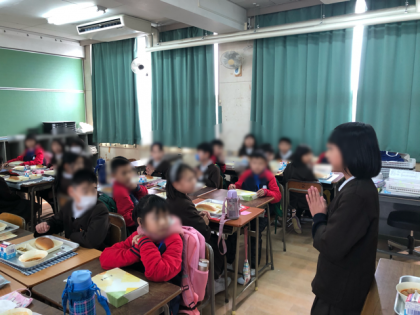 4年生は、中国の貴州市第二実験小学校の児童を学校に招待し、交流会を行いました。講堂でのセレモニーでは、お互いに挨拶をした後、中国の児童が歌を披露しつくれました。