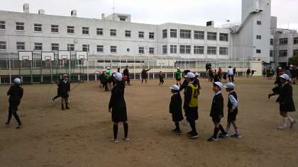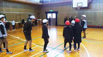 運動場と講堂に分かれて、たてわり班ごとに八の字跳びをしました。