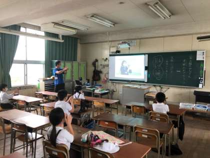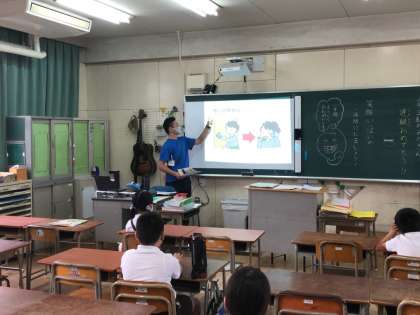 教室では、コロナウィルス感染予防の動画や、田辺小学校教職員が登場する手洗い動画を見ました。また、運動場に出て、かげふみ鬼ごっこなども行いました。