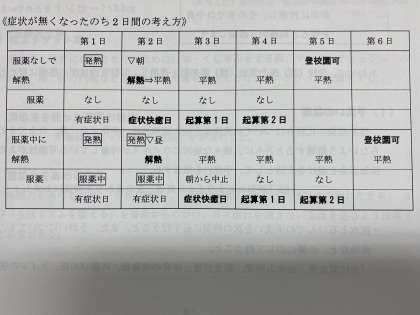 また、症状がなくなった日(0日目)から数えて、2日間は登校を控え、