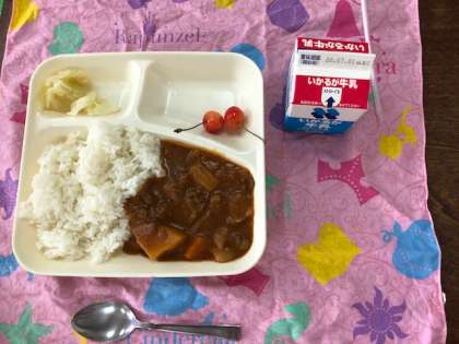 今日の給食は、ハヤシライス、キャベツのゆずドレッシング、さくらんぼでした!