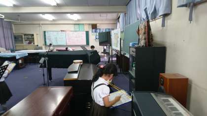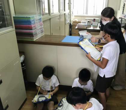 今回は1年生だけで、教職員の方にインタビューしたり、見つけたものをメモしたりしました。みんな、きちんと話を聞いて、一生懸命カードに書いていましたよ。