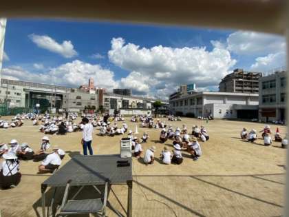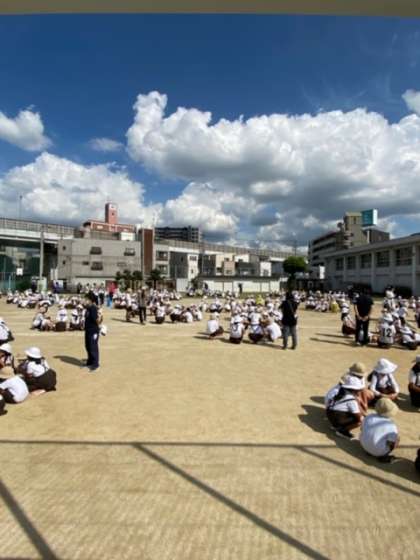 秋晴れの空のもと、今年度初めてのたてわり集会を運動場で行いました。