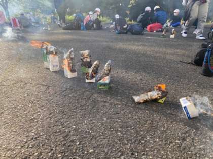 パンにソーセージをはさんでアルミホイルで包み、牛乳パックに入れて火をつけます。