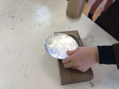 はじめに、丸型の錫をかなづちで叩き、模様をつけていきます。