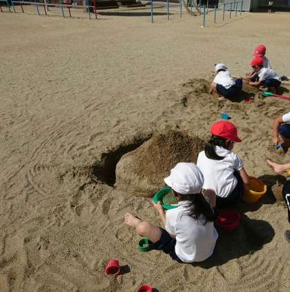 普段の休み時間は使用していませんが、今日は特別にいっぱい遊んでいいよ。子どもたちは、スコップやバケツを持って、喜んで砂場に向かいました。