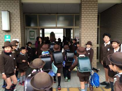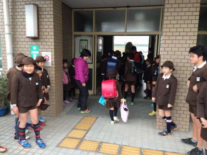 当日は、8時過ぎから登校班で正門に集まり、1年生から6年生までが大きな声で「おはようございます!」とあいさつをしました。