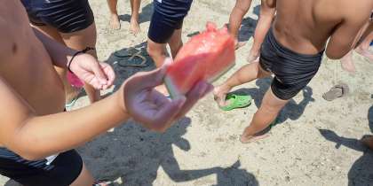 昨日より、よい泳ぎをする児童が増えてきました。おやつにスイカを食べ、その後お昼をいただきました。今から少しお昼寝です。13時45分頃から遠泳スタートです。