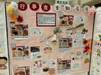 大阪市の中の6つの区の小学校や中学校の栄養教職員が、それぞれの区の取り組みを展示しています。東住吉区栄養教職員は、「行事食について知ろう」というテーマで、日本の伝統行事と給食に登場する行事食について展示しました。