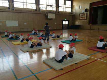 運動場では、50m走とソフトボール投げ、講堂では、上体起こしや立ち幅跳びなどをしました。