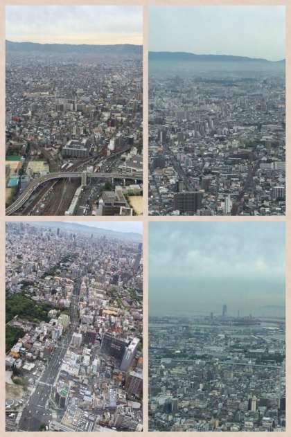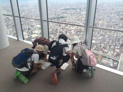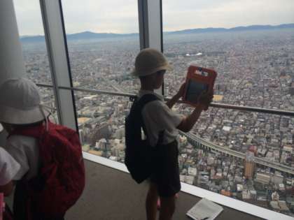 展望台見学では、グループになって大阪周辺の様子を記録したり、タブレットで撮影したりしました。