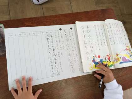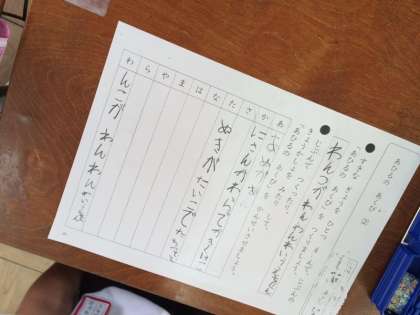 例えば「か」なら、「かえるが かけっこ かきくけこ」というように文章にしていきます。