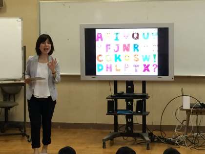 2年生は、アルファベットの学習を行い、アルファベットをもとに、果物の名前も英語で学びました。