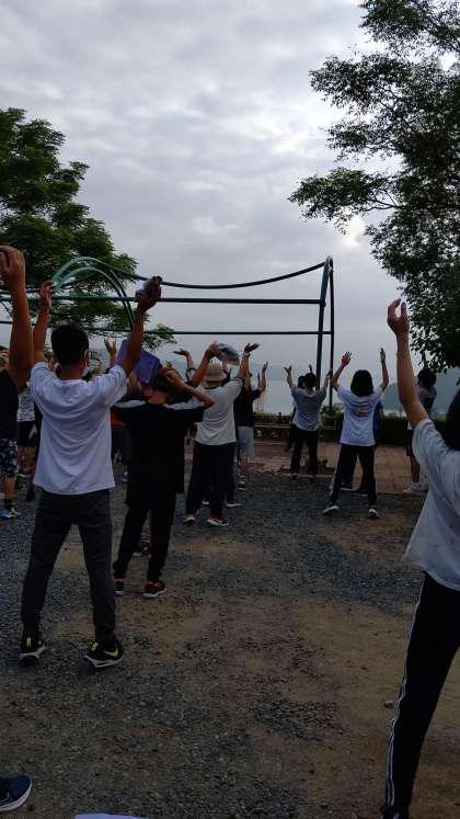 修学旅行2日目の朝です。山道を散歩し、ホテルの最上階にあるメダカの学校を散策しました。