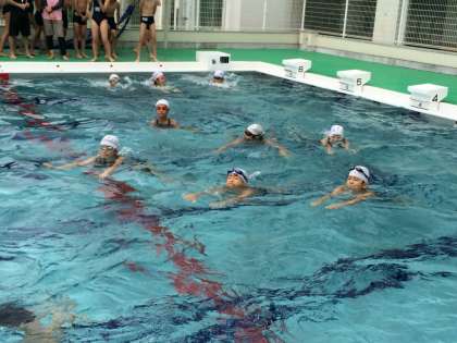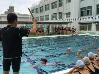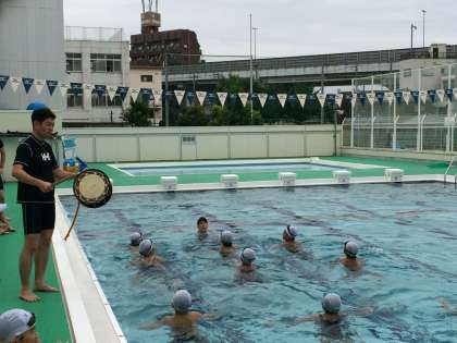 今日は、遠泳班ごとに隊列を作り、隊列を保ちながら泳ぐ練習をしました。