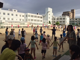 今日からラジオ体操が始まりました。朝早くからたくさんの子どもたちが校庭にあつまりました。