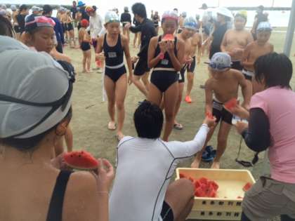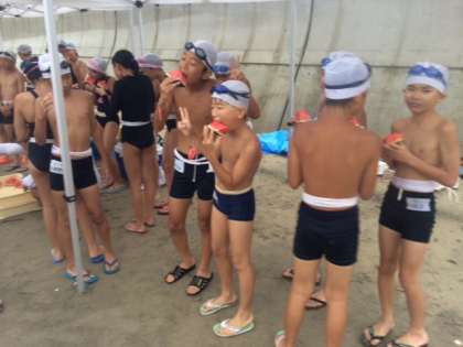 海から上がった後、浜でスイカを食べました。海の塩分がスイカにほど良く美味しかったです。