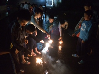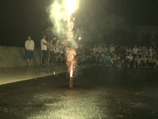 雨が上がった時間をねらって、宿舎の前で花火を楽しみました。生活班ごとに分かれて、一人一人が手持ちの花火を楽しんだ後、みんなで打ち上げ花火を見て、大いに盛り上がりました。