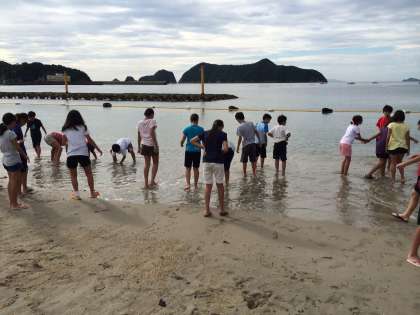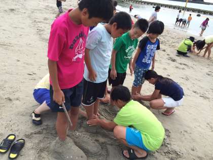 遠泳練習が終わり、ほっと一息、浜に再び出て生活班で浜遊びをしました。