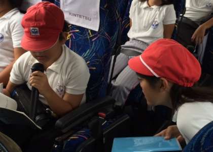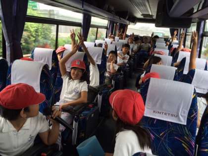 高速道路に入って、子どもたちのバスレクが始まりました。クイズや歌で車内は盛り上がりました。